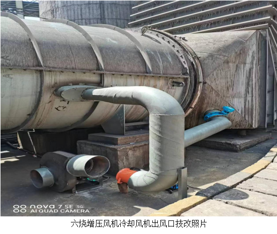 增壓風機是煙氣脫硫系統(tǒng)的重要設備,一旦發(fā)生事故,將造成整個脫硫系統(tǒng)停運。近期攀枝花天氣炎熱,三燒、六燒增壓風機前軸溫度偏高,給生產(chǎn)穩(wěn)定運行造成一定的風險。為了消除這個風險,生產(chǎn)部組織檢修到現(xiàn)場進行溝通、分析,打算在增壓風機冷卻風機出風口利用備用的冷卻風機將熱風抽出,并匯入主煙道中,以此來加強冷風的循環(huán),降低增壓風機前軸的溫度。