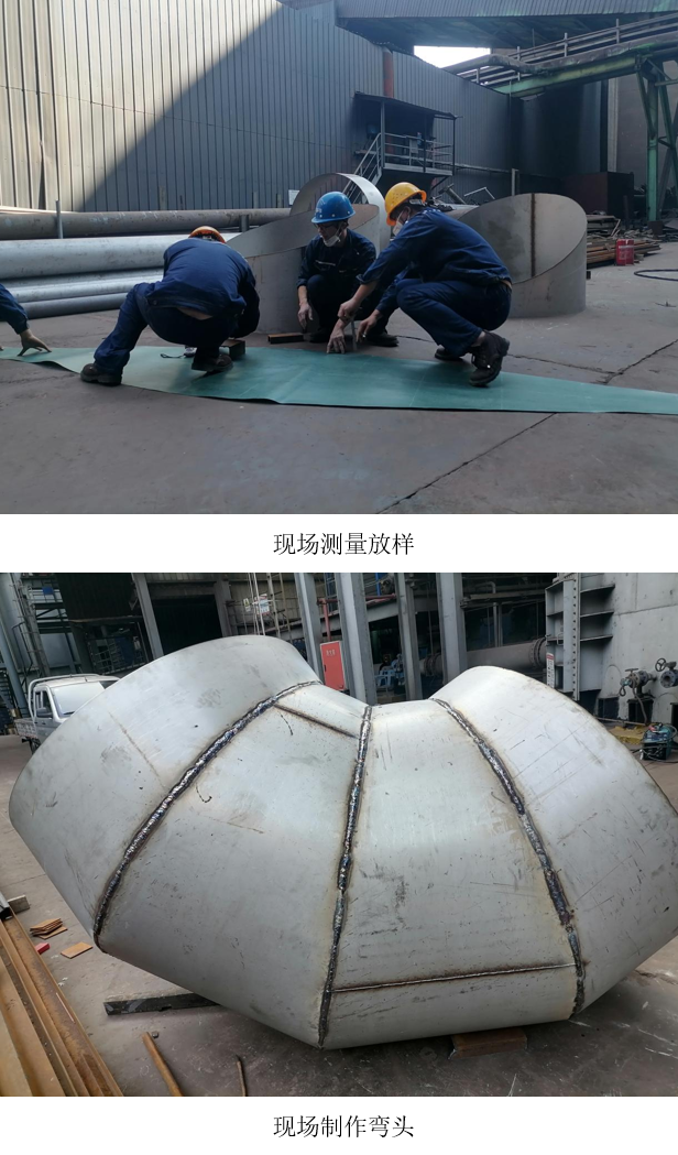 值得一提的是,這是西昌藍(lán)鼎首次獨(dú)立完成直徑1.32米彎頭制作全流程。面對(duì)不規(guī)則角度導(dǎo)致測量和放樣難度大的問題,檢修班長帶領(lǐng)班員在沒有專業(yè)放樣設(shè)備的情況下,憑借扎實(shí)的幾何計(jì)算功底和豐富現(xiàn)場經(jīng)驗(yàn),精準(zhǔn)完成多角度彎頭放樣;焊接人員采用分段對(duì)稱焊接工藝,有效控制不銹鋼焊接變形,確保煙道系統(tǒng)密封性和使用壽命達(dá)到設(shè)計(jì)要求。